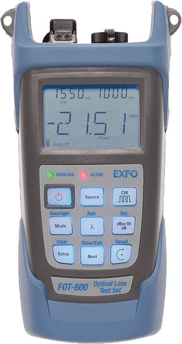 The FOT-600 optical loss test set is ideal for network link qualification; the 600 handheld device series includes the FPM-600 power meter and the FLS-600 light source. designed for best-in-class ease of use, the FOT-600 features a pass/fail LED indicator; in addition, it allows users to set their own absolute or relative loss measurement thresholds. With a memory capacity of 1000 data items and built-in reporting software.